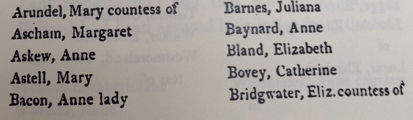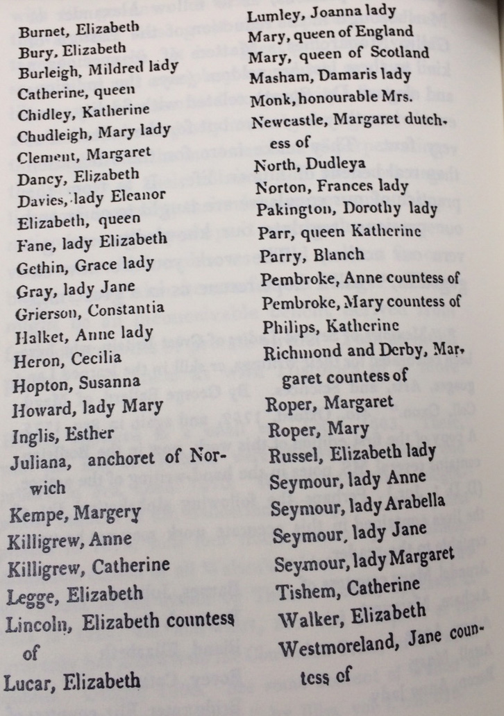 A footnote by Walker helpfully suggests that ‘Perhaps the following alphabetical list of the lives contained in this accurate work may not be unacceptable to the reader’. I’ve patched the list of ladies together somewhat crudely (sorry, but it saves typing it out!), and you can see that there is a gratifying number of them, some well known (Catherine of Aragon, Catherine Parr, Lady Jane Grey, Elizabeth I, Mary Sidney (‘the subject of all verse’), Anne Finch), other much less so.