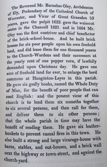 Worthington goes on to reproduce ‘a mural inscription within the Church of Great Gransden, in the County of Huntingdon, transcribed by me, Nov. 2, 1699’, in order to demonstrate that ‘you could not but acknowledge [Oley] to be a person of very great worth, if you knew no more than what I shall add.’ Here it is: