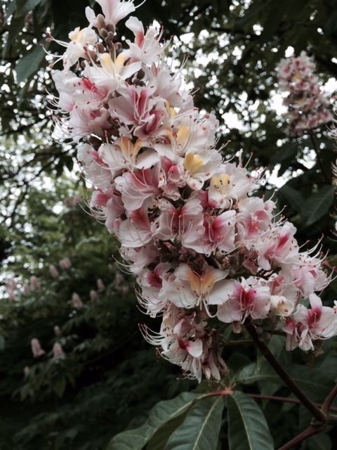 We were entertained en passant by a family of jays overhead in a flowering chestnut (Aesculus indica, from the Himalayas), the fully fledged young ones still insistent on being fed, and quite happy to ignore the human cluster a few feet below. The florets on the chestnut ‘candles’ change colour from yellow to red when they have been fertilised, thus letting bees know which ones not to bother with, and conserving their energy.