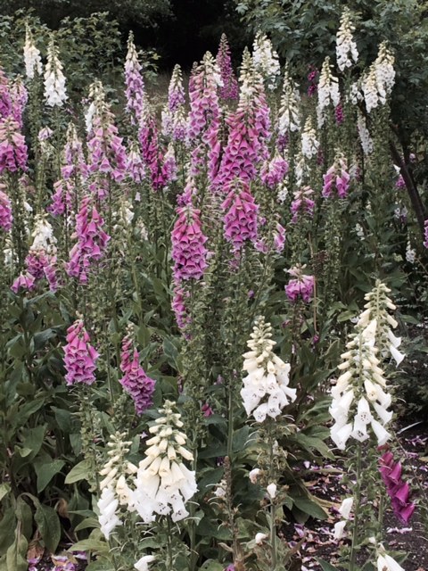 There were waterfalls of dog-roses, cascading down twenty feet from the trees which supported them, honeysuckle, field poppies, ox-eyed daisies, elder, purple loosestrife, white and purple foxgloves, larkspurs, and some garden escapees, including light purple oriental poppies, a philadelphus, lupins, and bright crimson antirrhinums sprouting from crevices in the stones lining the embankment as we trundled downhill into Sheffield. And if this wasn’t all amazing enough, there was a pair of llamas (or alpacas?) in a field …