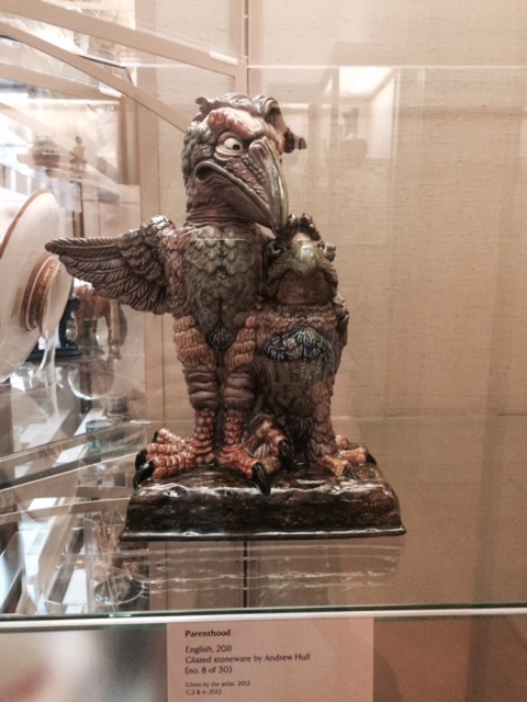 I wandered (trying to escape the strong smell of solvent making its sinister way up from the basement into the shop and café) into the ceramics galleries. I have mentioned before that I am not keen on Dresden shepherdesses and the like, but I do love works which hover around the indefinable point at which utilitarian craft merges with decorative art. (Does this make me a Ruskinian or Morrisian? I do hope so!)