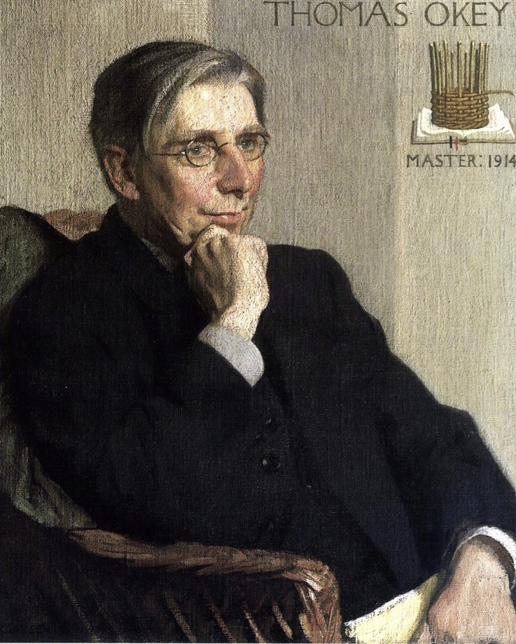 However, Okey did not abandon basketry: he was a member the Art Workers’ Guild (founded in 1884), and was made its Master in 1914 (William Morris had been Master in 1892, in spite of his ‘extreme’ politics). This striking portrait by Sir George Clausen marks his year of office. He was also a freeman of the Worshipful Company of Basket-Makers.