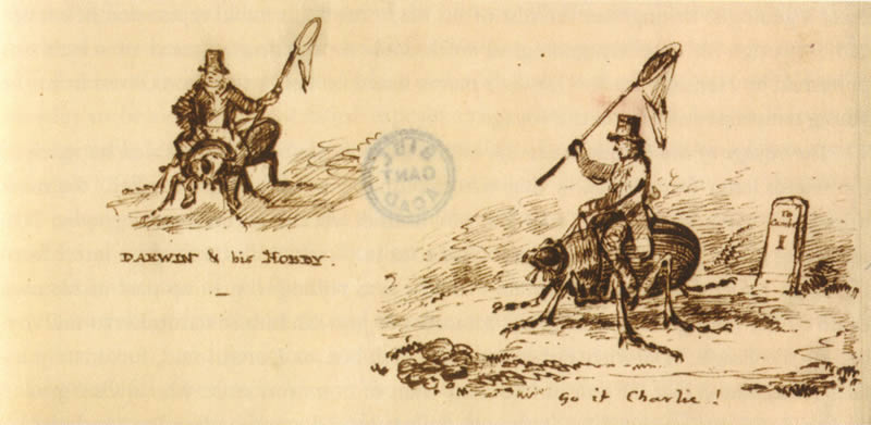 This famous cartoon shows Charles Darwin as an undergraduate, riding out. The beetle was probably not hired from a livery stable. (Credit: Cambridge University Library)