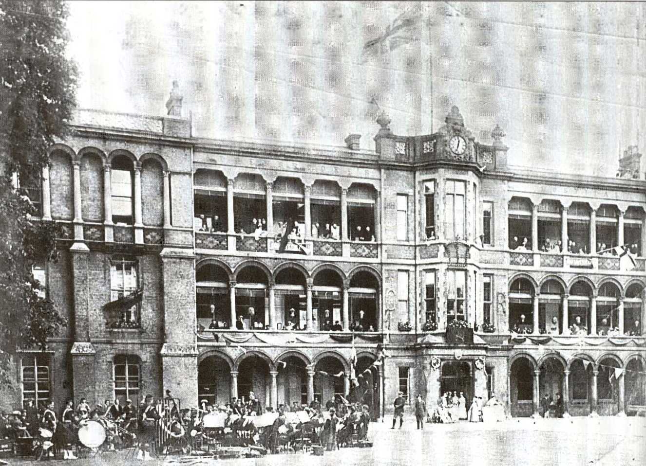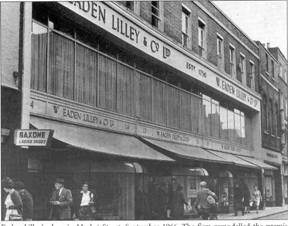 Shops are represented by W. Eaden Lilley and Co. on Market Street and Laurie and McConnal on Fitzroy Street, both now alas departed, though the little bandstand on the top of the latter’s roof can still be seen.