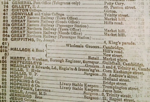 Sturton Bros., druggists, grocers, wholesale, were also on Fitzroy Street, while a grocer called Hattersley was at 5–6 Trinity Street, and Hallack and Bond, wholesale grocers, had four phone lines: in ‘Cambridge’, Hills Road, New Street, and Market Place (their retail outlet). Lawrence and Rose (butchers) were on Market Hill, and another butcher, Warrington and Sons, on Magdalene Street. The Danish Butter Company (??) was based in Fitzroy Street, while Chivers & Sons, the soft-fruit growers and jam makers, were then (as until recently) in Histon.