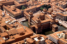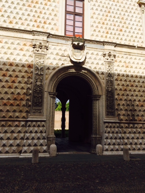 and, most terrific of all, the Palazzo dei Diamanti, a building spiked all over (a bit like those hedgehog cakes with sticking-out almonds or chocolate buttons) with stone ‘diamonds’, the latter being one of the Este heraldic devices.