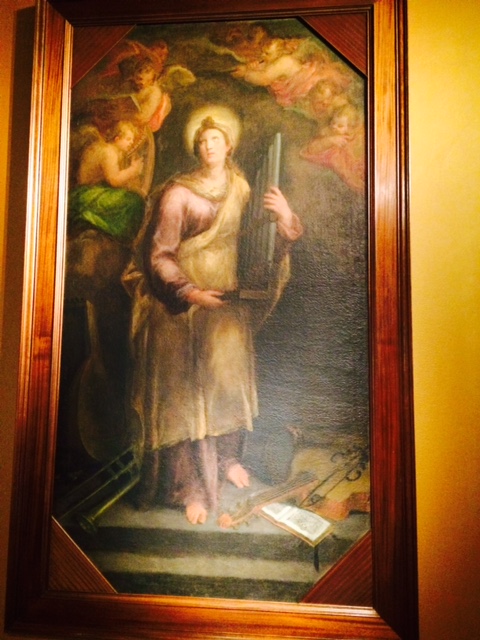 Other works that I enjoyed were this St Cecilia, looking a bit oppressed by her kit, including portative organ, lute, sackbut and bass viol – at least she’s got a cherub to play the harp parts;
