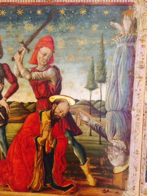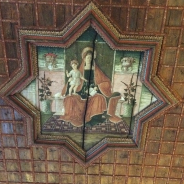 The Palazzo houses one of Italy’s national art collections, consisting, mainly and unsurprisingly, of paintings from the Ferrarese school. If you’d asked me to cite any member of it, I would have been able to come up with Dosso Dossi, not because I would recognise any of his works, but because he has a memorable name. But I’ve just learned two more: Sebastiano Filippi (1528/32–1602), known as il Bastianino, and the more gnomic Maestro delle occhi spalancati, who was active in Ferrara in the second half of the fifteenth century. ‘Spalancare’ means ‘to open wide’, as the room custodian helpfully explained to me, and this anonymous painter depicted his subjects with their eyes wide open. Here is a ceiling painting, originally from the monastery of St Antonio in Polesine: