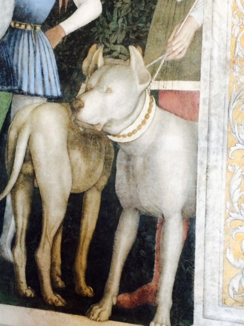The famous frescoed rooms were displayed to indicate one of the major state occasions for which the palace was used: the reception by Marchese Federico II Gonzaga (son of Isabella d’Este) of the Holy Roman Emperor Charles V in 1530, as he made his way to Bologna to be crowned by the pope. (Since his armies had sacked Rome in 1527, one assumes that an alternative location was thought preferable.) Charles V apparently had a thing about dining alone (that is, presumably, away from his host and other social more-or-less equals: I don’t think he actually cut his own bread). But there was also dancing (with the sixty most beautiful and noble ladies of Mantua roped in), music, horse-riding (Federico was devoted to his horses),
