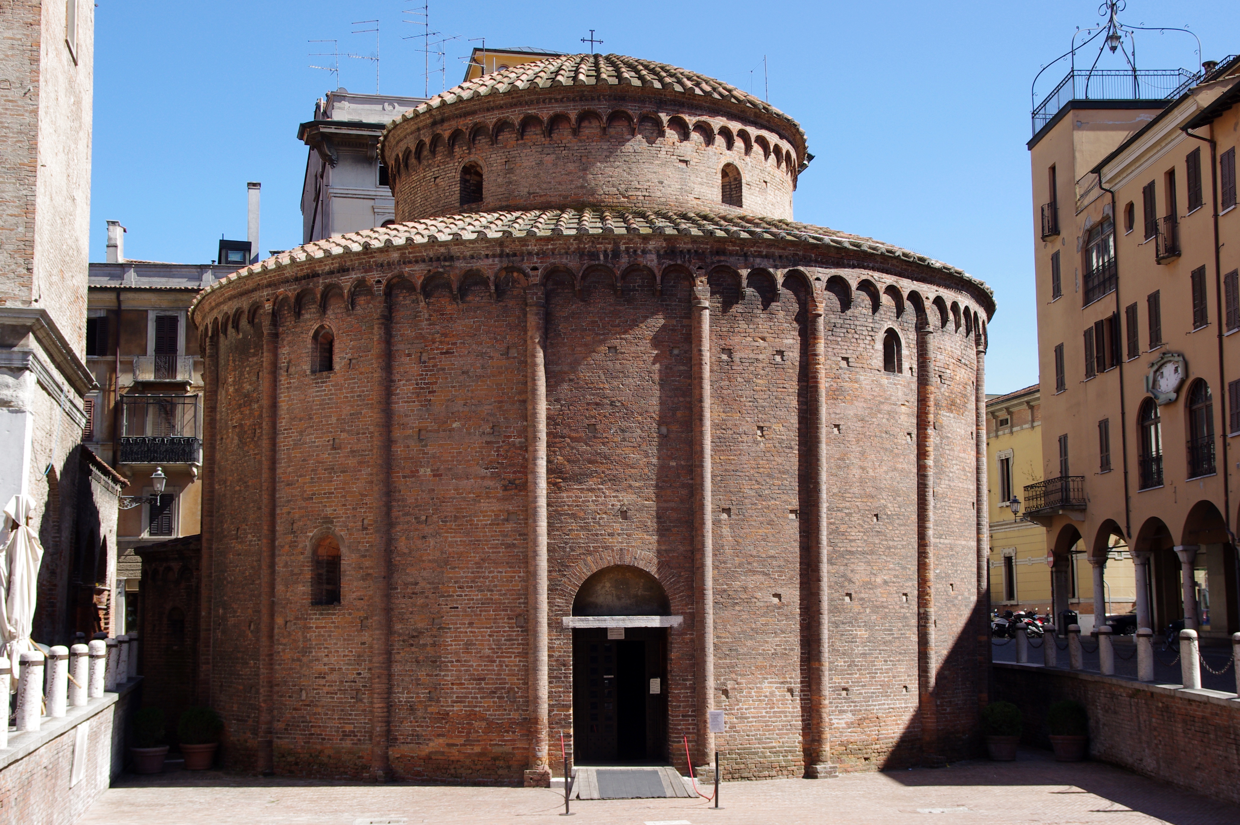 Next to the clock is the remarkable round church of San Lorenzo, built between 1040 and 1151. In 1579 the reigning duke ordered it to be closed, and it began to collapse. Ordinary rectangular buildings, mostly shops, began to engulf it, and the road surface gradually rose, so that when in 1907 the Commune decided to redevelop the area, they found the hidden framework of the church, largely intact and about six feet below the surrounding pavement. It was consolidated, but after about 20 years of indifference it was again in danger of demolition, until the Dominican Order, with huge faith and imagination, took it on. Ninety years later, it thrives as a chapel and exhibition space.