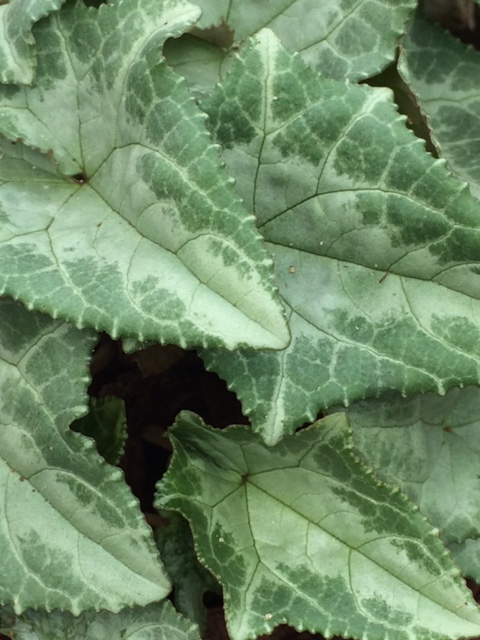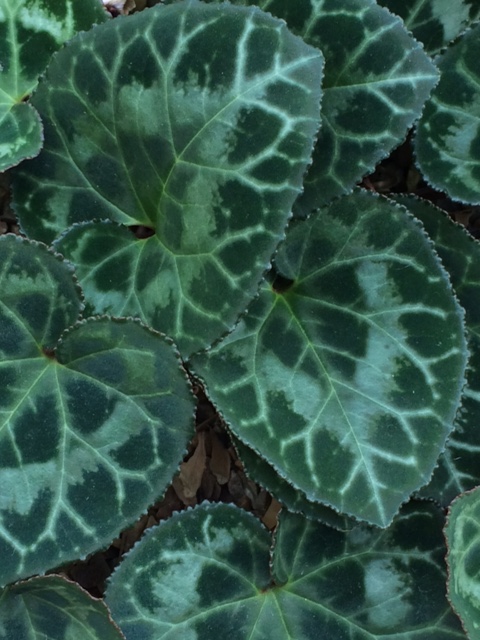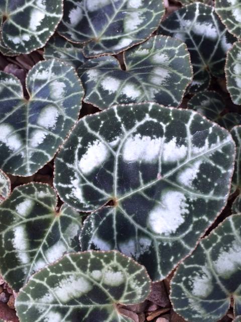The word ‘cyclamen’ (Latin, ‘cyclaminus’; Greek, κυκλάμινος) is thought to derive from the Greek word for ‘circle’, κυκλος, referring to the round shape of the tuber. In many languages, including English, the colloquial term refers to pig food: ‘sowbread’ (first reference in OED is from 1550: raises the interesting question of when the plant was first introduced here?), French ‘pain de pourceau’, Italian ‘pan porcino’, Dutch ‘varkensbrood’. The tubers are poisonous to humans, but in Lebanese cooking the leaves are used as a wrapping for food, like vine leaves for dolmades.