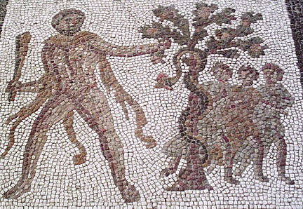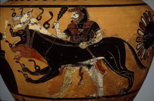 The golden apples taken by Hercules (some say by the giant Atlas, while Hercules had taken on his burden of holding up the world) could not be kept: Athena took them back to the garden after Eurystheus had agreed that the labour had been accomplished. The same thing happened with the twelfth and final labour: Cerberus the guardian beast of the Underworld, having been either wrestled into submission by Hercules or drugged with a doctored honey-cake, terrified Eurystheus so much that he ran off and hid in a huge jar; but Hades’ pet was then returned to him.