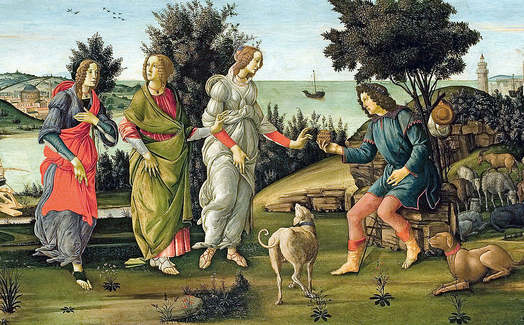 In this version of the Judgement of Paris (in the Galleria Cini in Venice), Botticelli has not followed the normal convention of depicting the three goddesses naked.