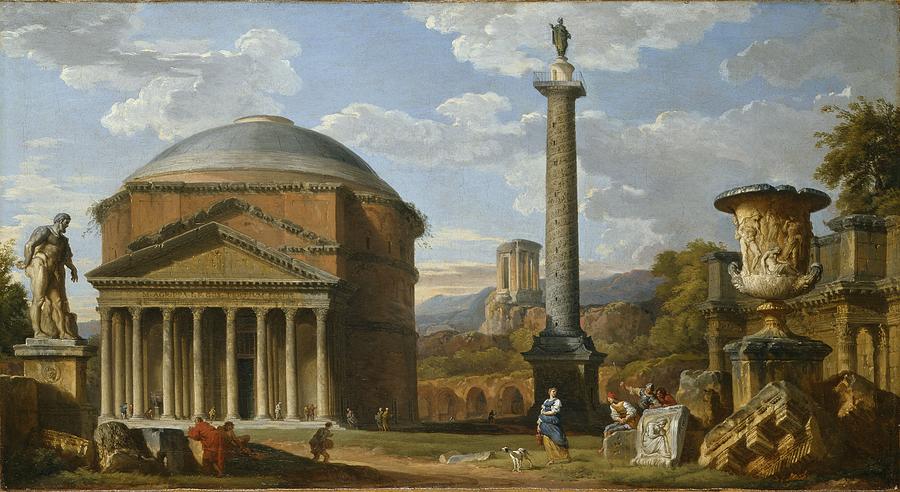 In this ‘Capriccio’ of Roman ruins by G.P. Pannini, the Farnese Hercules is put into unreal juxtaposition with the Pantheon, Trajan’s Column, a massive stone urn, and other architectural fragments.
