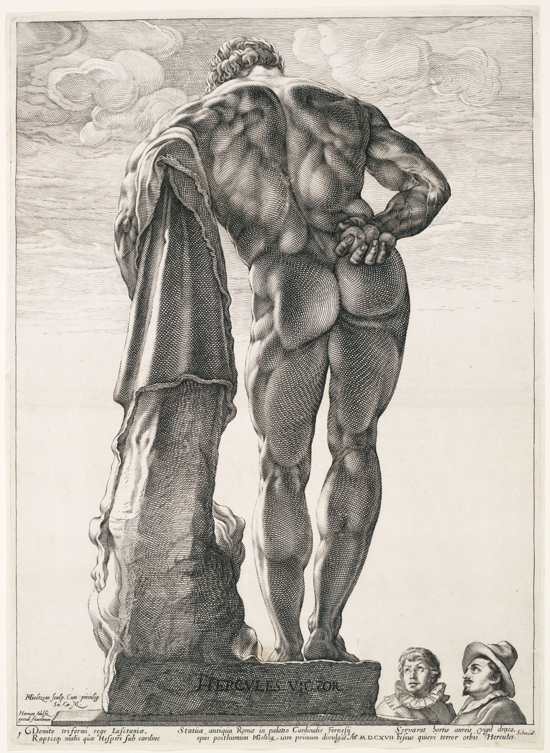 My object this month is taken from this exhibition: an plate by the famous Dutch engraver Hendrik Goltzius (1558–1617) showing Hercules leaning on his club, taking a rest after completing his eleventh labour, three golden apples in the hand behind his back.
