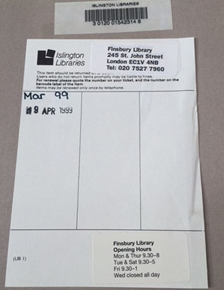 My second-hand copy used to belong to Finsbury Library, where it was borrowed once, on 9 April 1999. Finsbury Library’s loss is my gain, though it’s a relief to see online that the library itself still exists: you can never be sure these days, especially in London.