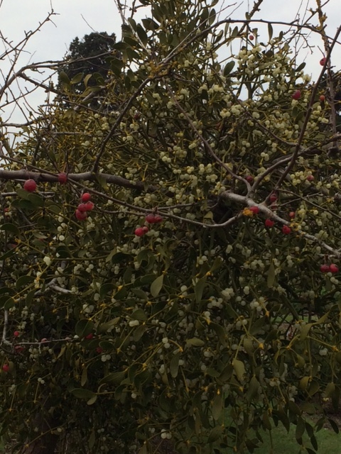 Mistletoe is sited in the family Santalaceae, or sandalwoods. It is hemiparasitic, in that it draws nourishment from its host plant, but its green leaves contain chlorophyll, so that it can also feed itself. The flowers are insignificant, yellowish and looking like new leaf buds, but of course it is the berries that are the important feature.