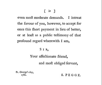 It is interesting to look at this list in conjunction with The Forme of Cury, a Roll of Antient English Cookery Compiled, about AD 1390, by the Master-Cooks of King Richard II, transcribed and edited by the Revd Samuel Pegge (1704–96) and published in 1780 (about which I have written before). Ordained in 1730 and elected a fellow of the Society of Antiquaries in 1751, Pegge approached his antiquarian task with great gusto, and his introduction is worth reading, even if you get no further.
