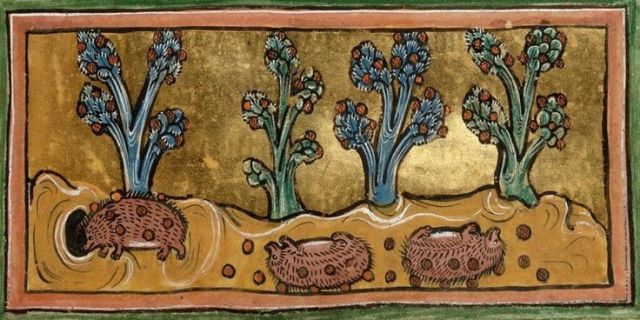 Hedgehogs pre-garnishing themselves. A French recipe instructs: ‘Hedgehog should have its throat cut, be singed and gutted, then trussed like a pullet, then pressed in a towel until very dry; and then roast it and eat with cameline sauce, or in pastry with wild duck sauce. Note that if the hedgehog refuses to unroll, put it in hot water, and then it will straighten itself’.