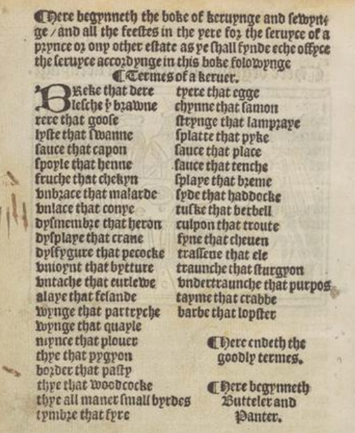 ‘Termes of a kerver: Breke that dere / lesche the brawne / rere that goose / lyfte that swanne / sauce that capon / spoyle that henne / fruche that chekyn / unbrace that malarde / unlace that conye / dysmembre that heron / dysplaye that crane / dysfygure that pecocke / unioynt that bytture / untache that curlewe / alaye that fesande / wynge that partryche / wynge that quayle / mynce that plover / thye that pygyon / border that pasty / thye that woodcocke / thye all maner small byrdes / tymbre that fyre / tyere that egge / chynne that samon / strynge that lamprey / splatte that pyke / sauce that place / sauce that tenche / splaye that breme / syde that haddocke / tuske that barbell / culpon that troute / fyne that cheuen / traffene that ele / traunche that sturgyo/ undertraunche that purpos / tayme that crabbe / barbe that lopster. Here endeth the goodly termes.’