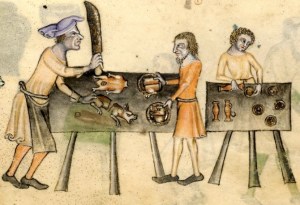There is virtually no roasting, so not much scope for the subsequent display of carving virtuosity – is this because roasting, whether on a spit or on a grill (not in an oven at this period), was such a self-evident activity (cook it until it’s cooked) that it didn’t have to be written down in any detail?