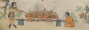 Spit-roasting small animals in front of a fire, also from the Luttrell Psalter, fo. 206v. (Credit: the British Library)
