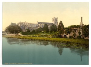 The priory church at Christchurch in a 1930s postcard, with ruins of the monastic buildings in the foreground.