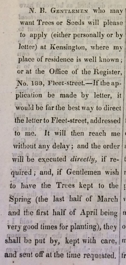 Finally, after two types of strawberry (‘the Keen’s Seedling and the Hautbois’), a hint of seeds, ‘arrived from America this fall. Indeed they are now in the Thames, and I expect them in a day or two. But I expect a great many more, and will therefore not make my catalogue before they arrive.’ The booklet ends with a repeated instruction about the placing of orders, ‘and that the directions for sending the parcels be given as plainly and fully as possible’.