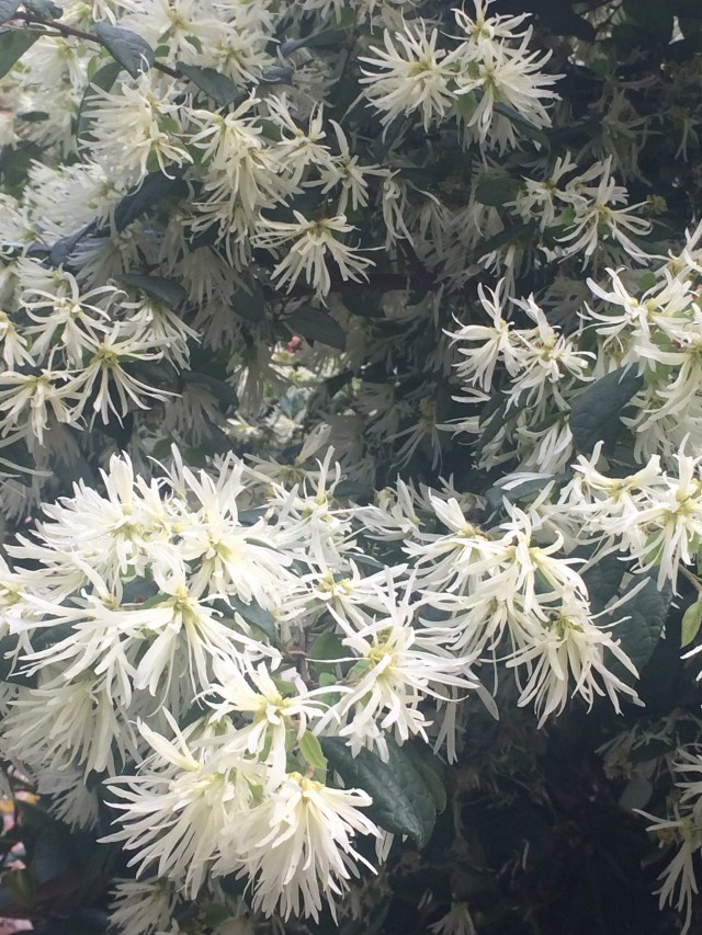 The gorgeous white (many species are pink) Loropetalum chinense, named by Daniel Oliver (1830–1916), who was Keeper of the Herbarium at Kew. (In 1864 he published a standard botany textbook, based on manuscripts left by Henslow and illustrated by the latter’s youngest daughter, Anne Henslow Barnard.) It is a witch hazel relative, and apparently hardy in the UK …