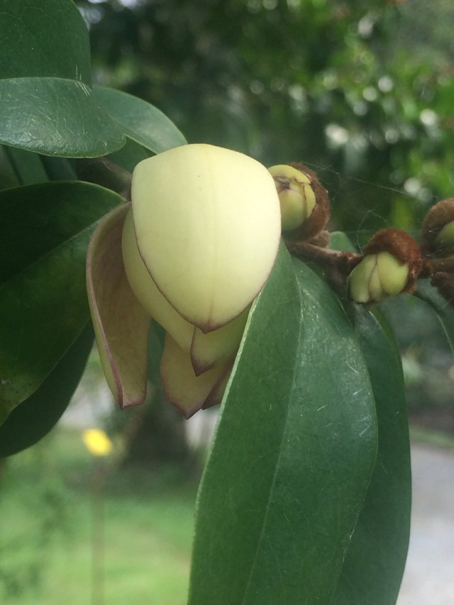 Magnolia figo, its creamy flowers, like those of the banana, edged with pinkish purple. From China, it was first described by the Portuguese Jesuit missionary and naturalist, João de Loureiro (1717–91).