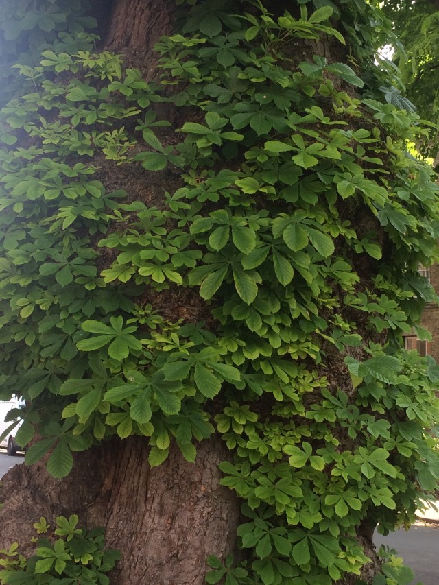 A horse chestnut (Aesculus hippocastrum) in a Cambridge street. New shoots appear from the scar tissue of lopped branches every spring.