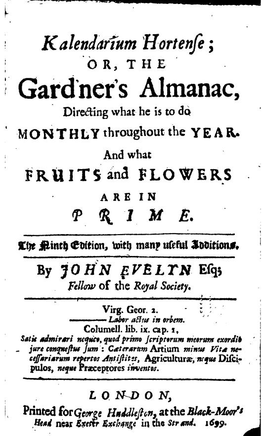 Evelyn’s Gardner’s Almanac was hugely popular: this is the frontispiece of the ninth edition, of 1699.