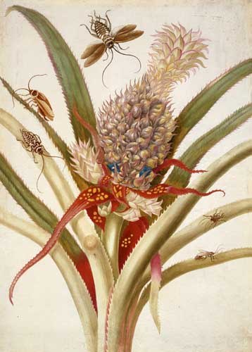 Maria Sybilla Merian depicted pineapples during her travels in Surinam: the image below was published in her De metamorphosibus insectorum Surinamensium of 1714 – which, as its title suggests, focused on insects, the exotic plants being shown ‘merely’ as their habitat or context.