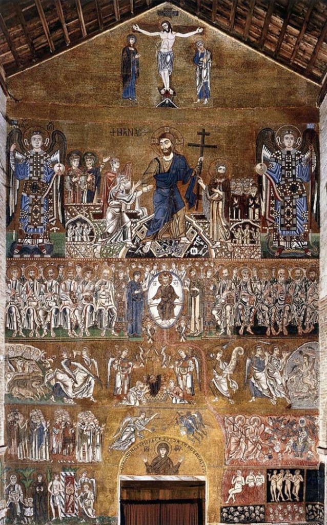 It is the rear wall , though, which really causes the jaw to drop. One huge mosaic, with six registers: the top one shows the Crucifixion, the second the Harrowing of Hell, and the four below the Last Judgment, as described in the Apocalypse of St John.