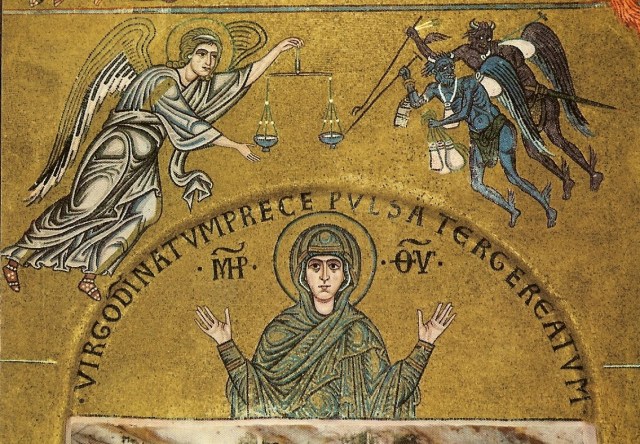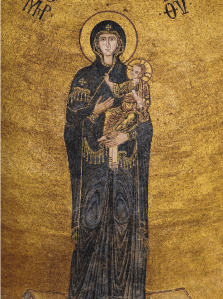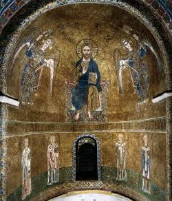 However, you don’t really need silence (nice though it would be) to marvel at the interior of the church. The apse behind the altar where the remains of St Heliodorus rest contains a mosaic depicting the Virgin and Child in the Byzantine ‘Hodegetria’ style, against a background of pure gold: below her are ranked the twelve apostles, the Evangelists and St Paul being marked out by their books, and St Peter by his keys.