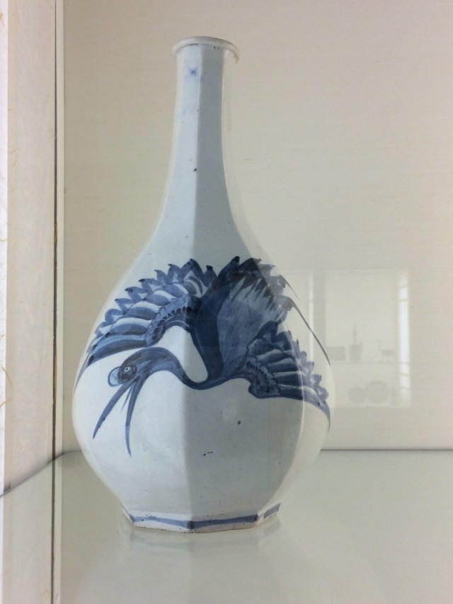 A Korean octagonal porcelain bottle, depicting a crane (symbol of long life), c. 1850-1900, given to the Fitzwilliam Museum by W.M. Tapp.