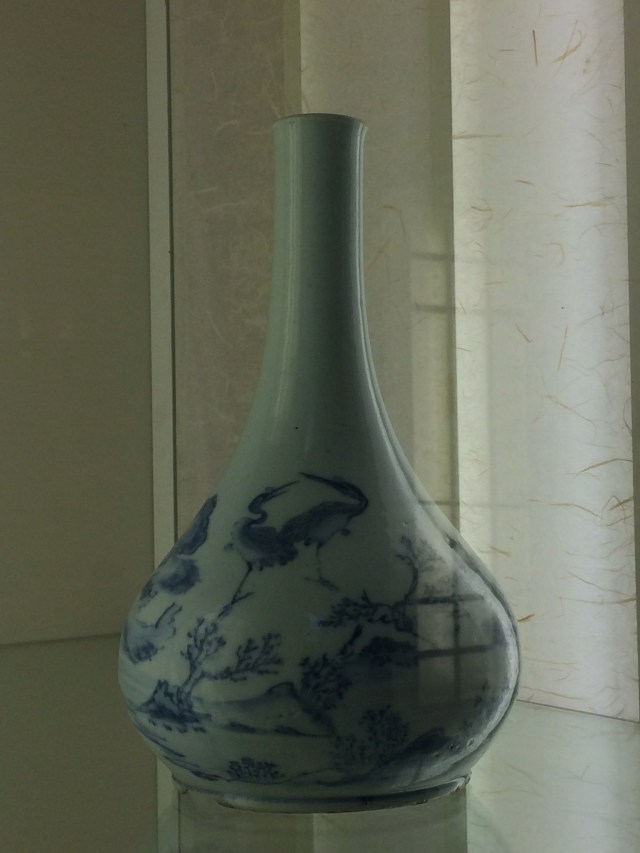 Nineteenth-century Korean bottle showing cranes in a landscape, given by W.M. Tapp.