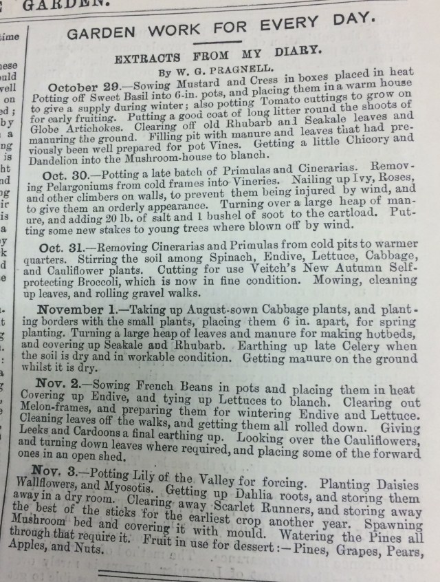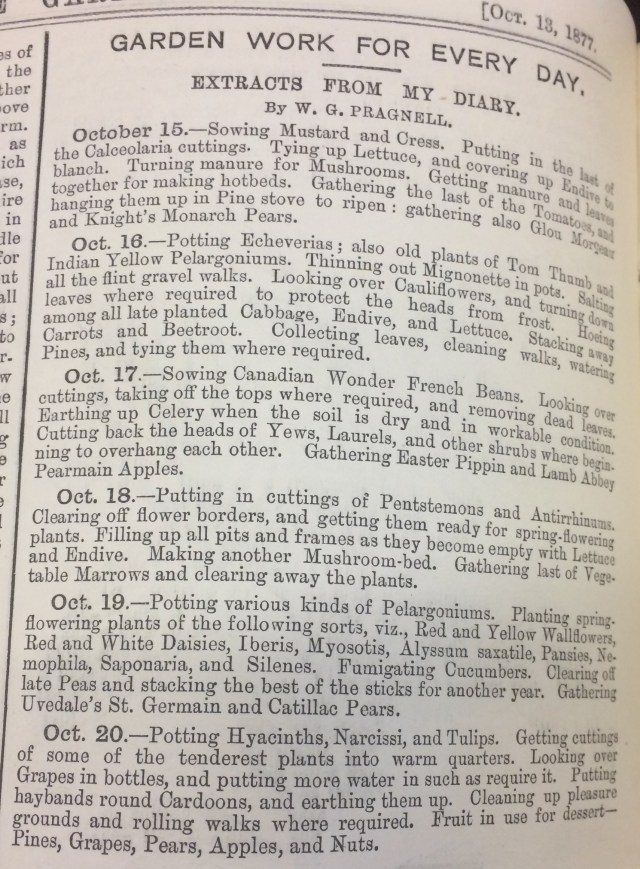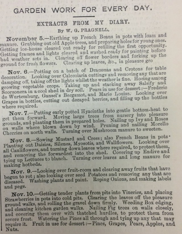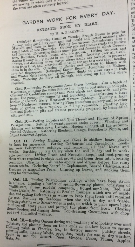 Going through to October, there is a lot of emphasis on potting up pelargonium cuttings from a large number of varieties: this is presumably building up stocks for bedding out (was William Robinson grinding his teeth as he read this?) next summer. But there is also ‘clearing out all water-spouts and drains before the rainy season sets in’, and ‘roping onions’, ‘looking over seed potatoes’, making pegs, labels, etc.’ as activities for wet weather.