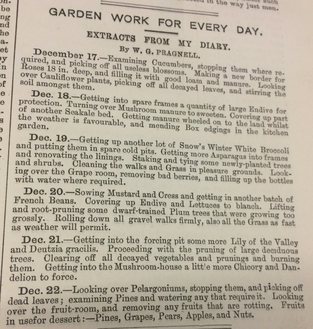 In early November, ‘pips’ of lily of the valley are potted up for forcing for Christmas, while a new mushroom bed is ‘spawned’, and the ice-house is cleared out, ‘ready for refilling the first opportunity’.