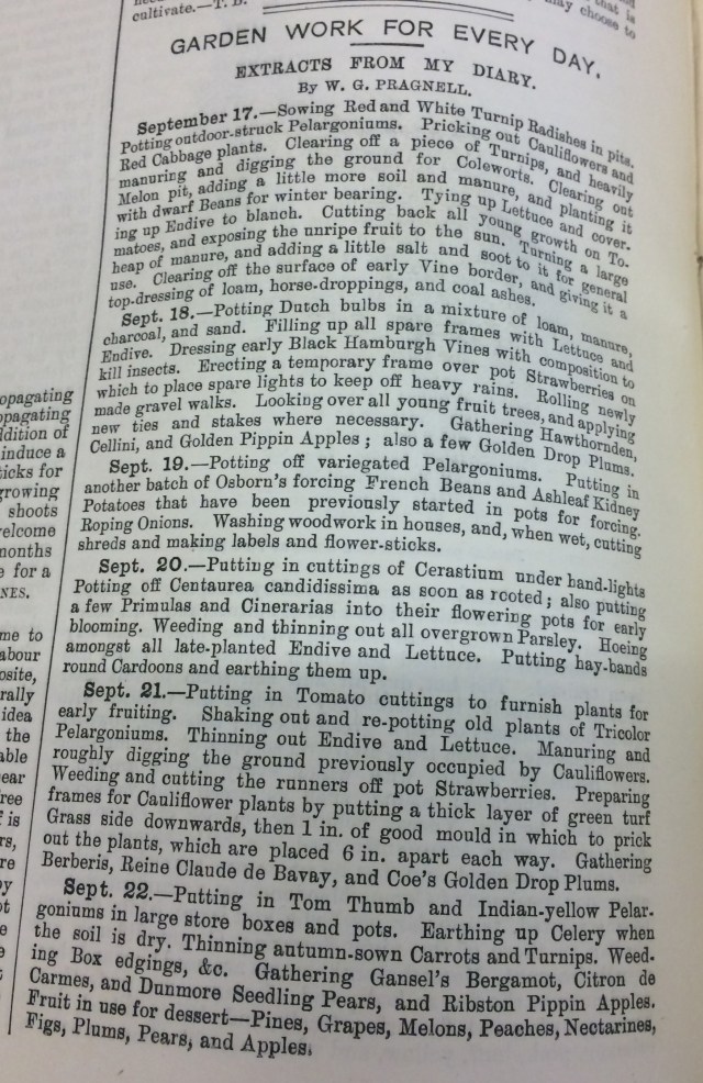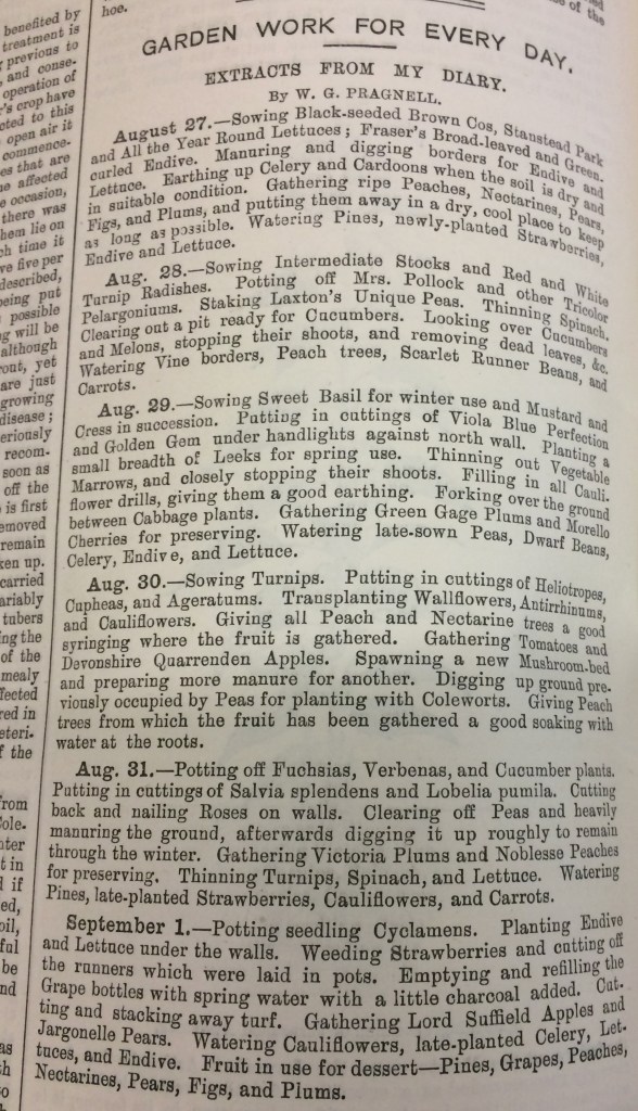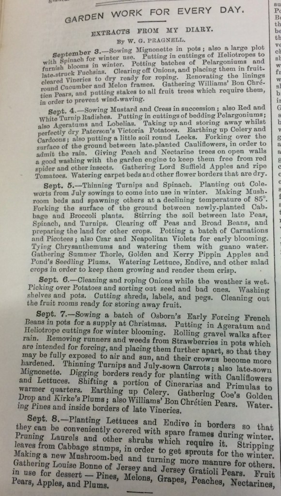 Note the reference to the Black Hamburg Grape bunches, to be cut and stood in bottles of water: this was a recognised way of preserving ripe grapes which is frequently referred to in The Garden. I also like the gathering of ‘gherkins, cucumber, cauliflower, onions, etc., for mixed pickles’.
