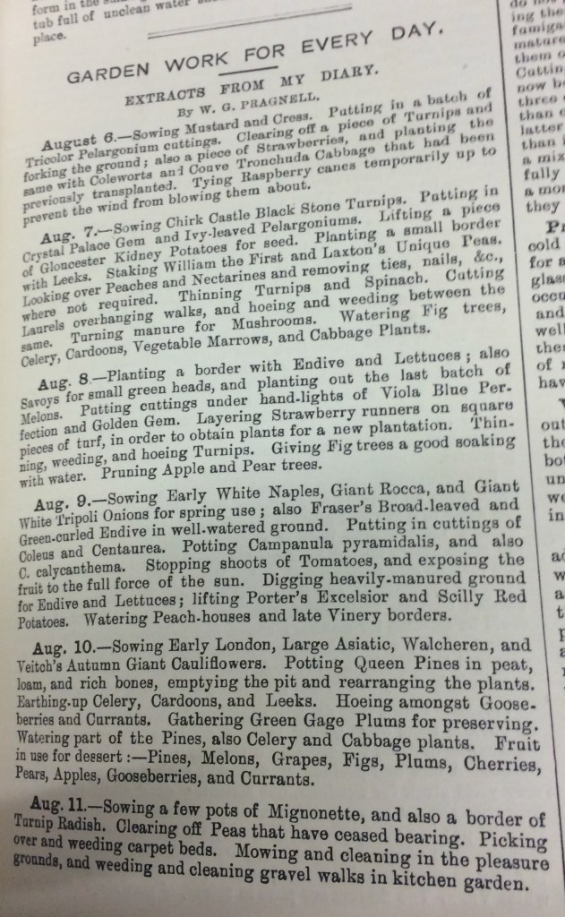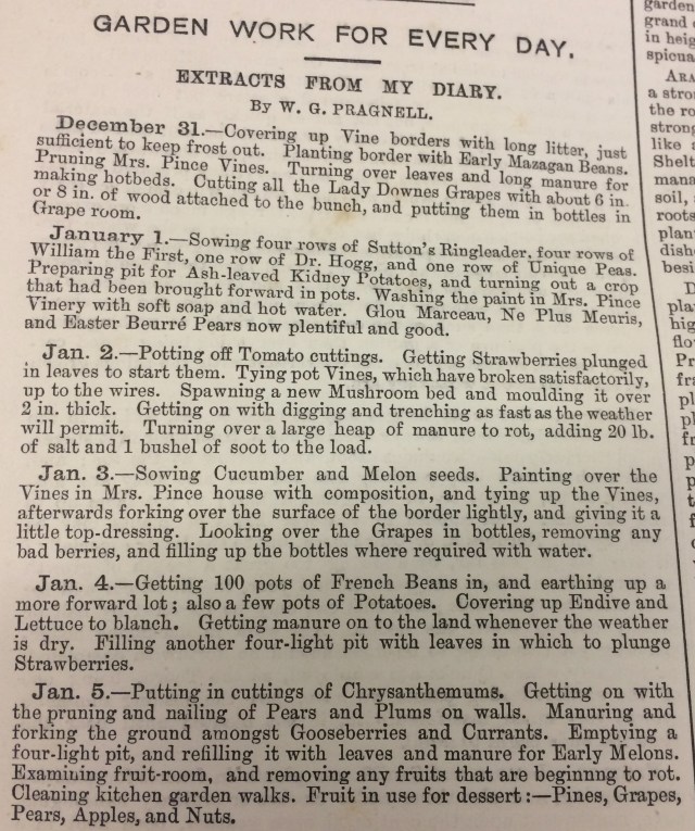 One of the most interesting regular columns is a ‘what to do this week in your garden’ – or rather, ‘what I did this week in my garden, for you to catch up with’. Several gardeners contributed over the years, but the (to me) most engaging was Mr W.G. Pragnell, who in addition to his Herculean labours in the garden also listed the fruits made available to the house for dessert.