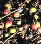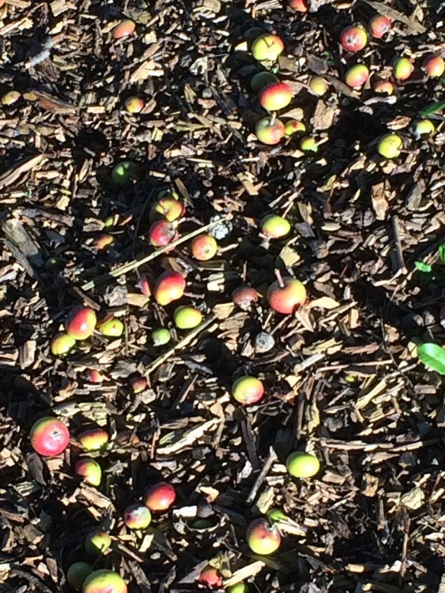 Part of the carpet of tiny apples fallen from Malus tschonoskii.