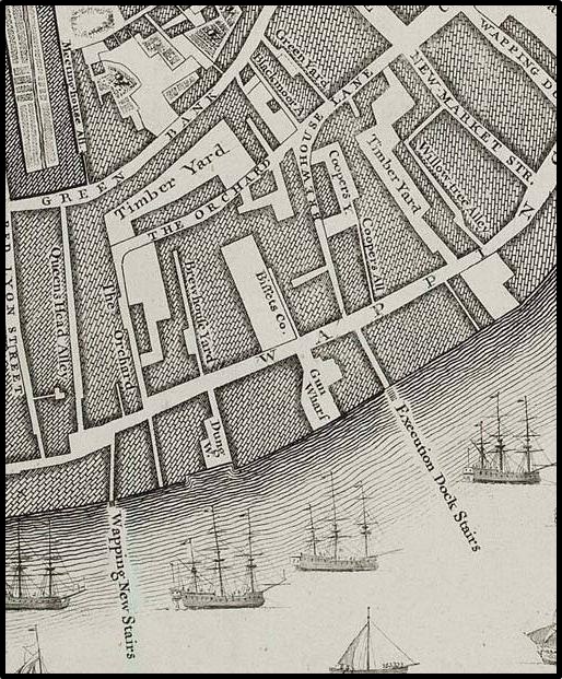 Execution Dock Stairs, from John Roque’s famous 24-sheet map of London, 1746. It’s all achingly hip round here these days (Dung Wharf being no longer accessible), but I can recommend Urban Baristas, next to Wapping Station.