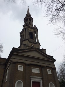 The 1669 church was rebuilt in its current (one hopes final) form in 1820 as one of the city’s ‘Waterloo churches’ and sits on a high stone embankment which has a memorial plaque inserted, now completely eroded and illegible, alas, above Shadwell Basin. This impressive wall presumably shows the original level of the church above the water of the docks – I can only say that it’s quite a number of steps up which to lug a baby in a buggy. But we were rewarded on this occasion by the church being open, with an ugly but (after previous exertions) very welcome ramp up its front steps.