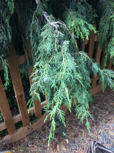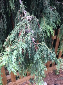 With the Lawson cypress, Murray honoured the Edinburgh Provost and nurseryman Charles Lawson (1795–1873), who had sponsored William Murray (no relation) on an expedition to try and trace the vanished plant hunter John Jeffrey, among whose retrieved possessions were seeds of the tree. However, all this, though interesting, is in fact irrelevant, because the Lawson cypress has greeny-bluish-greyish branches, and ‘my’ tree’s are a brownish red.