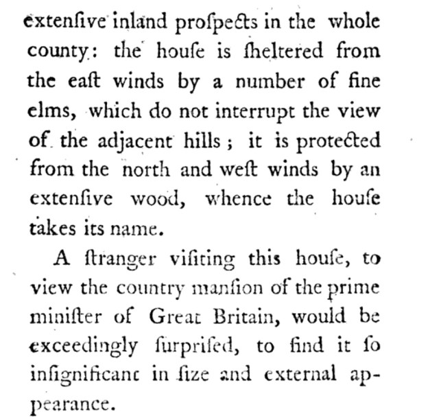 After this slightly dismissive sentence, however, he goes on to explain that Pitt chose the house (where he lived from 1785 to 1803) because it was close to his family home at Hayes, as well as to the seats of Lord Camden (Pitt the Elder’s Lord Chancellor, and eponym of the London district) at Chislehurst and Lord Sydney (supporter of Pitt the Elder and eponym of Sydney, N.S.W.) at Frognal; moreover, it has wonderful views in all directions, including a panorama of London, ‘where St Paul’s majestically rises, as if artificially erected, to terminate the view … it may not, perhaps, be improperly stiled an amphitheatre of parks, woods, and villages, spires, hills, and mansions, which in these charming prospects are not only various, but extensive’.