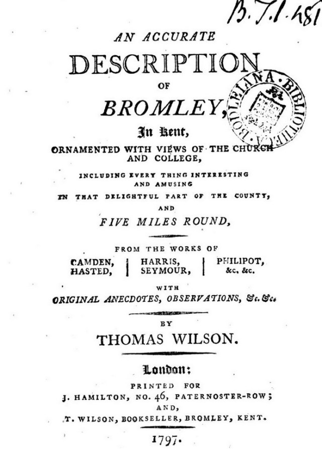 The title page of Wilson’s book, which indicates that he is Bromley bookseller, and that this is a cut-and-paste job.
