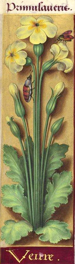 Given that the primrose is a native European plant, it is curious that it does not often appear in art before the early modern period. Roses, strawberries, violets, pinks, snowdrops, poppies, cornflowers, all abound in medieval manuscripts, but there are very few primroses. This plant is from the amazing Grandes Heures d’Anne de Bretagne, in the Bibliothèque Nationale, part of a sequence of flowers throughout the work, but it is a bit stylised to fit the rectangular format, with the stems too long.