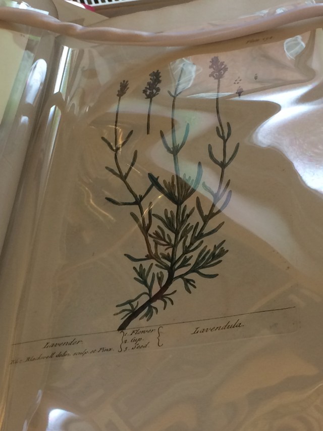 I was also very excited to see a coloured copy of Elizabeth Blackwell’s Curious Herbal, which I first encountered last year in Modena. She of course lived in Swan Walk while working on the project by which she hoped to rescue her family from penury, and both Sloane and Miller encouraged her. The book was open at a page depicting lavender, and it was matched with a similar image by a modern botanic artist.