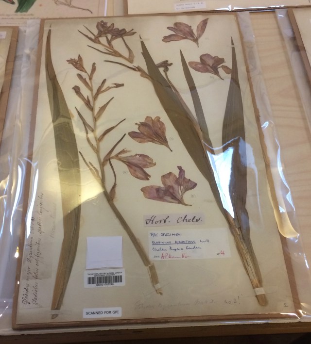 Turning to the herbarium collection, now in the Natural History Museum, there were several pages on display, including the type-specimen for Gladiolus byzantinus, with Miller’s own ink annotations down the left-hand side, followed by a short pencil note by none other than Daniel Solander, who worked on the herbarium, presumably after it had been conveyed to the British Museum, where he was made curator of the natural history collections in 1773.